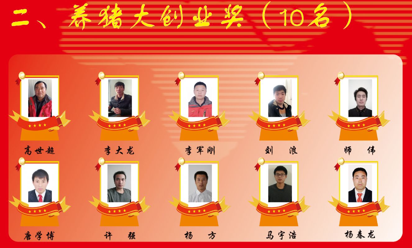 咸陽正能養殖公司: 劉 體 “養豬大創業獎” 10名 榆林正輝養殖有限公司 李軍剛 隴東事業部服務專員 唐學博 寶雞坪頭豬場 楊 方 商洛柞水豬場 李大龍 咸陽渭濱豬場 高世超 咸陽事業部技術服務 許強 劉浪