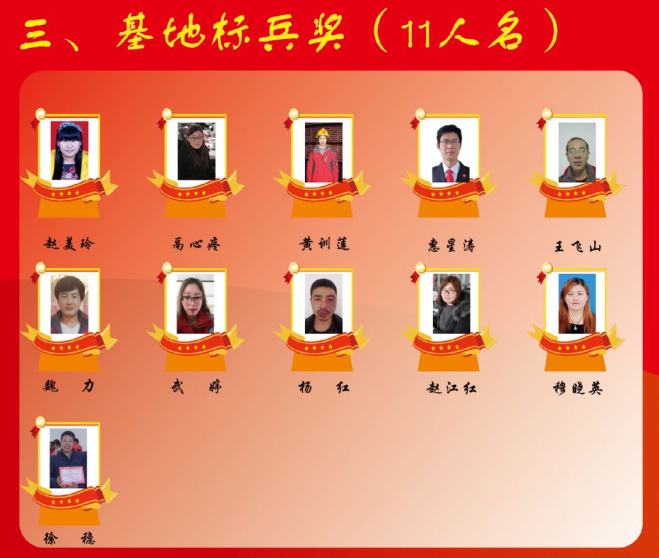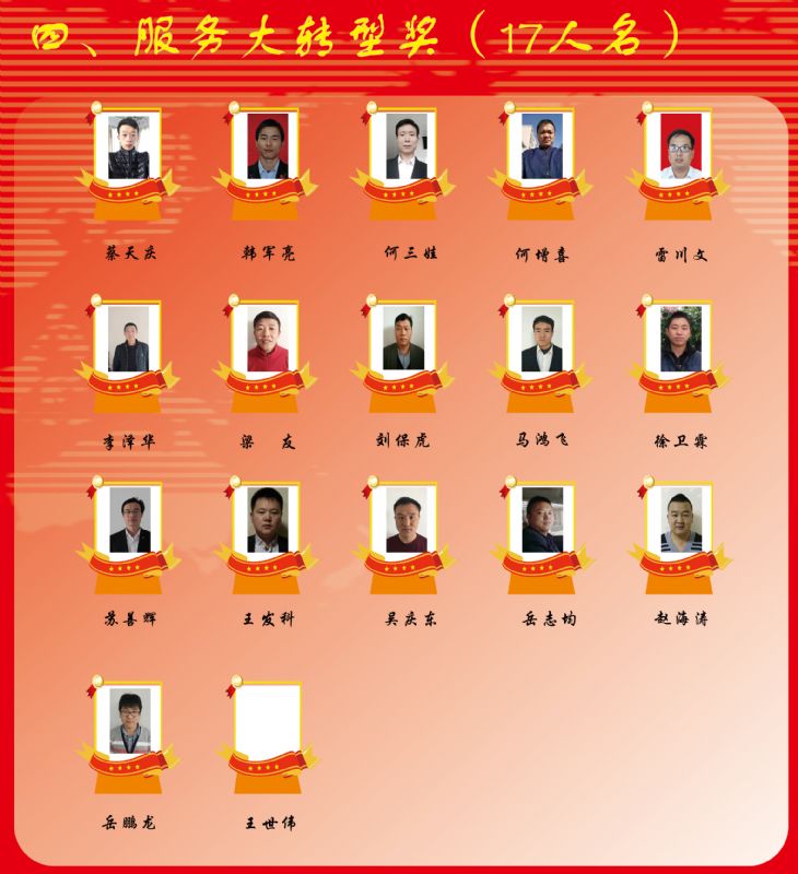 渭南事業部技術服務 馬宇浩 師偉 楊春龍 “基地標兵獎“ 11名 甘肅事業部武威基地2人:穆曉英 王飛山 山西事業部新絳基地2人:武 婷 楊 紅 高陵基地6人: 趙江紅 鬲心疼 黃訓蓮 魏力 徐穩 惠星濤 山東營銷公司1人: 趙美玲 “服務大轉型獎”17名 西安事業部:徐衛霖 王發科 甘肅事業部:岳志均 趙海濤 蔡天慶 咸陽事業部:梁友 何增喜 渭南事業部:蘇善輝 雷川文 韓軍亮 山西事業部:吳慶東 劉; 岳鵬龍 馬鴻飛 隴東事業部:李澤華 何三娃 隴南事業部:王世偉 “英雄團隊獎”13支 青海養殖服務公司 渭東養殖服務公司 渭北養殖服務公司 榆林西養殖服務公司 涇三高養殖服務公司 禮乾養殖服務公司 安康東養殖服務公司 西安大客戶養殖服務公司 靜寧養殖服務公司 高陵基地生產部 武威養殖服務公司 稷山養殖服務公司 臨汾養殖服務公司